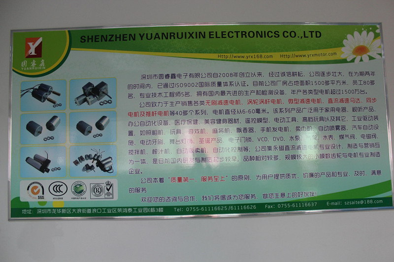 深圳市圓睿鑫電子有限公司自2008年創(chuàng)立以來,經(jīng)過誠信耕耘,在為期兩年的時間內(nèi),已通過ISO9001:2000國際質量體系認證。公司廠房占地面積2000多平方米,員工100人,專業(yè)技術工程師6名,擁有國內(nèi)最先進的生產(chǎn)和檢測設備,年產(chǎn)各類減速電機超過2~300萬臺。因公司發(fā)展需要,于2020年底,將生產(chǎn)基地遷往擁有最美小鎮(zhèn)之稱的東莞市清溪鎮(zhèn),依山傍水,依托美麗的大自然環(huán)境和地方文化,全新的東莞市圓睿鑫電子有限公司將借助深圳母公司平臺,一步步走上新的臺階。 東莞公司將繼續(xù)致力于生產(chǎn)銷售各類無刷減速電機 渦輪渦桿電機,微型減速電機,直流減速馬達,交流手搖發(fā)電機、同步電機及空心杯電機等,電機直徑從6-60毫米為定位,系列產(chǎn)品廣泛用于智能家電、智能辦公自動化設備、智能醫(yī)療、美容健身器材、遙控模型、電動工具、高檔玩具以及其它工業(yè)驅動裝置,如高檔玩具、游戲機、麻將機、飄香器、手機發(fā)電機、柔巾機、自動噴霧器、汽車自動設施、電動牙刷、舞臺燈飾、圣誕產(chǎn)品、智能電子門鎖、VCD、DVD、水泵、氣泵、水表、煤氣閥、電磁閥、攪拌機、榨汁...